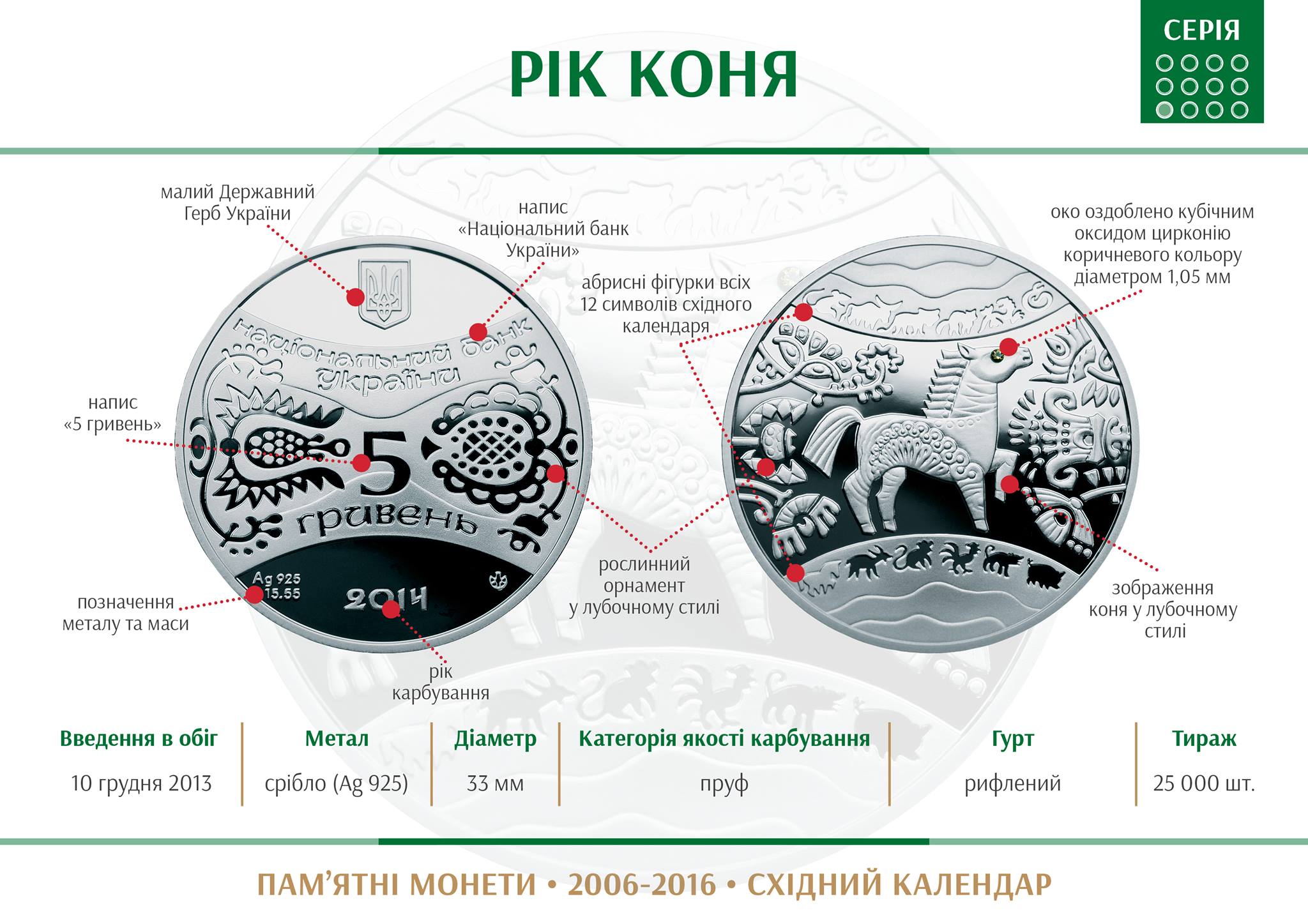 | Рік Коня | срібло(Ag 925) | 5 гривень | 570 | 10 грудня 2013 |