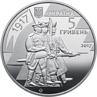 На аверсі монети розміщено: угорі малий Державний Герб України, праворуч від якого напис УКРАЇНА, під яким номінал та рік карбування монети - 5/ГРИВЕНЬ/2017; у центрі стилізована композиція, витримана у стилістиці українського авангарду початку ХХ століття - вояки в одностроях різних військових формувань часів Української революції, один з яких тримає прапор, на якому напис 1917; унизу - логотип Банкнотно-монетного двору Національного банку України.