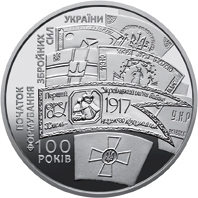На реверсі монети стилізовано зображено прапори перших українських військових формувань, чільне місце серед яких займає прапор Першого Українського козацького полку імені Богдана Хмельницького, історичні прапори Українського Державного флоту, Українського Запорізького полку, сформованого у Москві з вояків-українців тощо; унизу - прапор сучасних Збройних Сил України та розміщено написи: 100/РОКІВ (унизу ліворуч) ПОЧАТОК ФОРМУВАННЯ ЗБРОЙНИХ СИЛ (ліворуч вертикально) УКРАЇНИ (угорі)