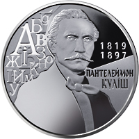 На реверсі монети зображено портрет П. Куліша, ліворуч від якого літери алфавіту, праворуч – написи: роки його життя 1819/1897 та ПАНТЕЛЕЙМОН/ КУЛІШ.
