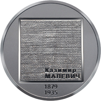На реверсі монети на матовому тлі стилізовано-фактурно зображено художнє полотно, підготовлене до роботи, на тлі якого внизу розміщено напис КАЗИМИР/МАЛЕВИЧ, унизу – роки життя 1879/1935.