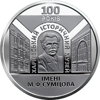 На реверсі монети розміщено стилізовану композицію: ліворуч та праворуч зображено фасади будівель музею різних періодів, у центрі – декоративна арка, в якій зображено портрет М. Ф. Сумцова та написи: 100/РОКІВ (угорі), ХАРКІВСЬКИЙ ІСТОРИЧНИЙ МУЗЕЙ (над портретом півколом), ІМЕНІ/ М. Ф. СУМЦОВА (унизу на матовому тлі).