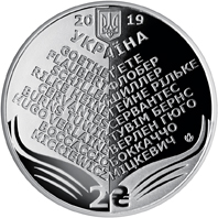 На аверсі монети розміщено: угорі – малий Державний Герб України, праворуч та ліворуч від якого зазначені цифри 20 19, під гербом напис УКРАЇНА; унизу номінал – 2 ?; стилізовану композицію, що символізує книгу перекладів Миколи Лукаша – ліворуч на матовому тлі зазначені автори: GOETHE/FLAUBERT/SCHILLER/RILKE HEINE/CERVANTES/BURNS TUWIM/HUGO VERLAINE/BOCCACCIO/MICKIEWICZ, праворуч, на дзеркальному тлі – ҐЕТЕ/ФЛОБЕР/ШИЛЛЕР/ГЕЙНЕ РІЛЬКЕ/СЕРВАНТЕС/ТУВІМ БЕРНС/ВЕРЛЕН ГЮГО /БОККАЧЧО/МІЦКЕВИЧ. Праворуч на дзеркальному тлі розміщено логотип Банкнотно-монетного двору Національного банку України.
