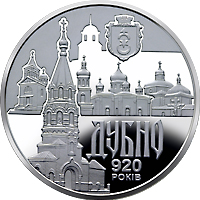 На реверсі монети вгорі праворуч – герб міста Дубно; на дзеркальному тлі абрису Дубенського замку зображено композицію з найцікавіших культових споруд міста Дубно, унизу праворуч на дзеркальному тлі написи: ДУБНО/ 920/ РОКІВ.