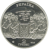 На аверсі монети розміщено: угорі - напис УКРАЇНА, стилізовану композицію: на тлі державного прапора України рядки - ЩЕ НЕ ВМЕРЛА УКРАЇНИ/І СЛАВА, І ВОЛЯ,/ЩЕ НАМ, БРАТТЯ/МОЛОДІЇ,/ УСМІХНЕТЬСЯ/ДОЛЯ., під якими - малий Державний Герб України, праворуч і ліворуч зображено групи виконавців гімну; унизу - номінал 2/ГРИВНІ, рік карбування монети - 2015 (праворуч), логотип Монетного двору Національного банку України (ліворуч).