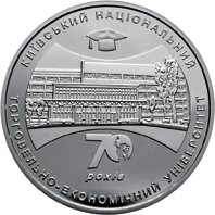 На реверсі монети зображено будівлю університету та розміщено написи: 70 РОКІВ (під будівлею) КИЇВСЬКИЙ НАЦІОНАЛЬНИЙ (півколом угорі) ТОРГОВЕЛЬНО-ЕКОНОМІЧНИЙ УНІВЕРСИТЕТ (унизу).