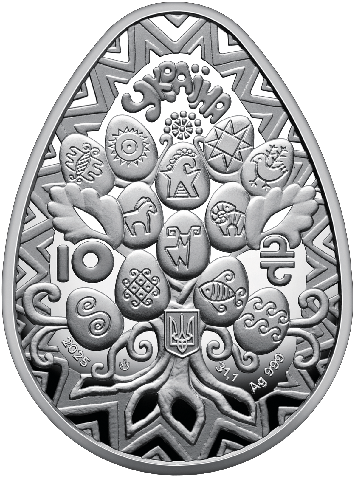 На аверсі монети в центрі композиції розміщено стилізоване дерево життя, яке є символом всесвіту, зображеним у формі дуба – образу сили, захисту, довголіття, чоловічої мужності та вірності. Дерево умовно поділено на три яруси (світи), кожен з яких містить 12 писанок, що відображають 12-річний цикл, із символами, притаманними кожному світу. У верхній частині дерева, що відображає небесний світ, зображені берегиня – жінка-богиня, охоронниця всього сущого, над якою розташована стилізована квітка як символ людської душі; сонце – джерело життя і шанований із давніх часів небесний вогонь; зірка (ружа) – символізує сонце, життя, розвиток і благополуччя; бджола – знак родючості та працьовитості; птах – уособлення вічності, безсмертної душі та духів предків. Стовбур дерева є зображенням земного світу, в якому розміщені образи: оленя – тварини, що приносить світло, асоціюючись із землеробством і знаннями; коня – символу сили, руху та чоловічої природи; барана – уособлення творчої енергії. Нижня частина дерева, коріння, представляє підземний світ і воду, тут відтворено такі символи: сигма (S), що зображує підземного змія як охоронця домашнього вогнища; оберіг, який поєднує знаки хреста, ромба, сварги, рогів барана й крапок; риба – символ родючості, життя і християнства; хвилі, які уособлюють безперервний рух води, життя й світу в цілому. Навколо дерева – рамка з трикутників, що символізує триєдність всесвіту: небо, земля і вода, а також відображає концепцію божественної трійці, гармонію і завершеність через рівнобічний трикутник. У верхній частині монети зазначено напис УКРАЇНА, нижче – номінал 10 (ліворуч) та графічний символ гривні (праворуч), малий Державний Герб України, рік карбування монети 2025, логотип Банкнотно-монетного двору Національного банку України, а також позначення металу та його проби – Ag 999, маси в чистоті – 31,1.