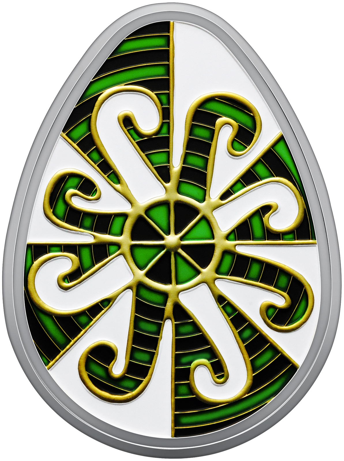 На реверсі монети зображено традиційну писанку Одеської області, відому як “Сорокопуть” або “Козачі левади”. Писанка оздоблена складними орнаментами, кожен з яких має глибокий зміст. Сварга – один із найдавніших символів сонця, щастя, добра, побажання благополуччя та захисту від лиха. Прямий і косий хрести уособлюють тривимірний всесвіт, що об’єднує різні рівні буття. Драбинки символізують духовне зростання, шлях до Бога та прагнення до вищого життя. Сонце на писанці уособлює джерело життя – небесний вогонь, який завжди шанували як символ тепла і світла. Розташовані на білому тлі дві сварги, накладаючись одна на одну під кутом, створюють ефект постійного руху та енергії. Це враження підсилюється серединним колом, яке символізує космос і нескінченність. Поєднання зеленого й чорного кольорів, окреслених жовтим контуром, додає орнаменту особливої напруги та сили, що надихає і заряджає енергією.