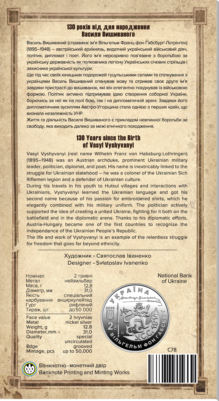 Пам’ятна монета присвячена Вільгельму Францу фон Габсбурґу-Лотрінґену (1895–1948) – представнику європейської аристократії, який увійшов в історію України під псевдонімом Василь Вишиваний. Ерцгерцог австрійський, полковник легіону Українських січових стрільців, поет, дипломат, державний діяч – він був яскравим і непересічним учасником українських визвольних змагань початку ХХ століття. Займаючи визначне місце як на військовому фронті, так і в міжнародних дипломатичних колах, Василь Вишиваний усією своєю діяльністю утверджував ідеали незалежної, соборної України. Завдяки його активній участі Австро-Угорська імперія стала однією з перших країн, що офіційно визнала Українську Народну Республіку.