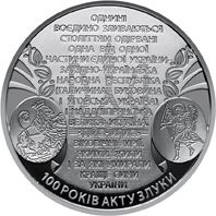 На реверсі монети на дзеркальному тлі розміщено фрагмент Акта Злуки: ОДНИНІ/ВОЄДИНО ЗЛИВАЮТЬСЯ/СТОЛІТТЯМИ ОДІРВАНІ/ОДНА ВІД ОДНОЇ/ЧАСТИНИ ЄДИНОЇ УКРАЇНИ -/ ЗАХІДНО-УКРАЇНСЬКА/ НАРОДНА РЕСПУБЛІКА/ (ГАЛИЧИНА, БУКОВИНА/ І УГОРСЬКА УКРАЇНА/ І НАДДНІПРЯНСЬКА/ВЕЛИКА УКРАЇНА./ ЗДІЙСНИЛИСЬ/ ВІКОВІЧНІ МІРЇ,/ЯКИМИ ЖИЛИ/І ЗА ЯКІ УМИРАЛИ/КРАЩІ СИНИ/ УКРАЇНИ. Латентним зображенням на тексті проглядається зображення Тризуба. Ліворуч і праворуч від напису розміщено медальони із зображеннями символів земель: лева - Західної України (ліворуч) та Архангела Михаїла - центральної України (праворуч), від яких угору йде стилізований рослинний орнамент у вигляді лаврових галузок, унизу напис півколом 100 РОКІВ АКТУ ЗЛУКИ.